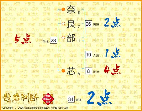 生活面を象徴する運勢です。外部から受ける影響力を表し、結婚運、家庭運や職場、環境への順応性を表します。総運から人運を引いた画数。姓や名が1文字の場合を除く。