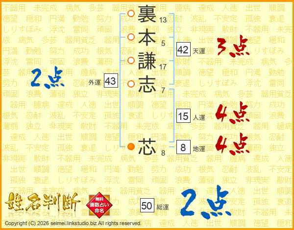 裏本謙志芯さんの人運は15画の4点!