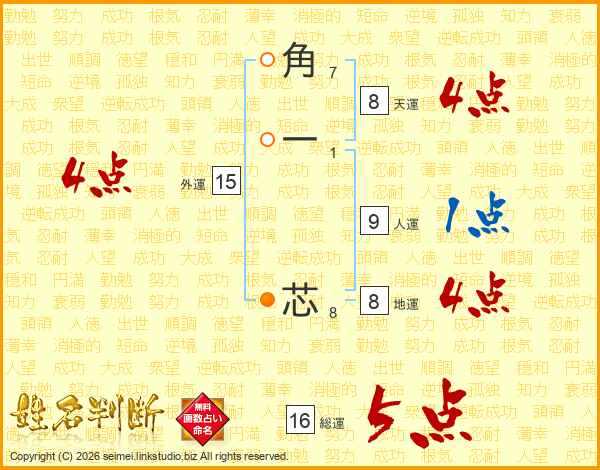 角一芯さんの総運は16画の5点!