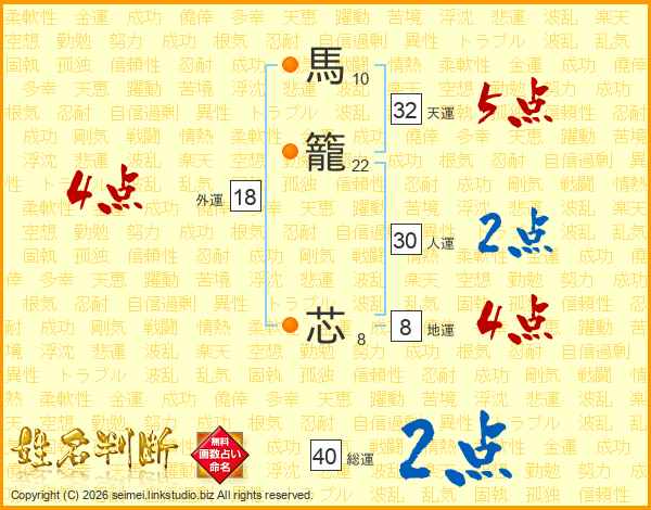 馬籠芯さんの総運は40画の2点!