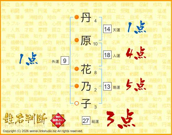丹(4画)原(10画) 花(8画)乃(2画)子(3画)