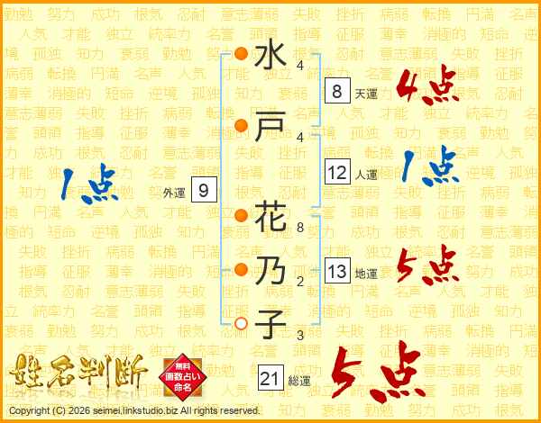水(4画)戸(4画) 花(8画)乃(2画)子(3画)