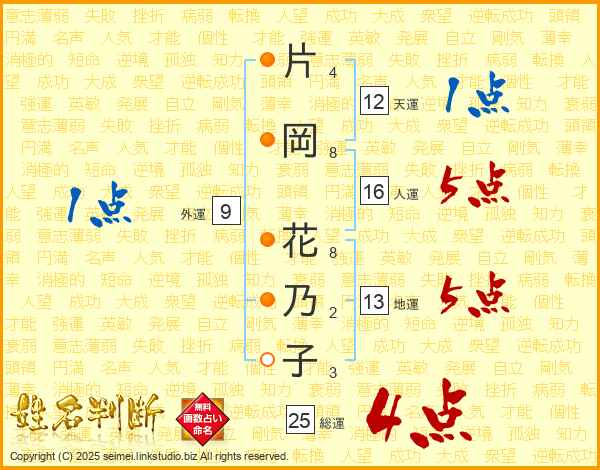 片(4画)岡(8画) 花(8画)乃(2画)子(3画)