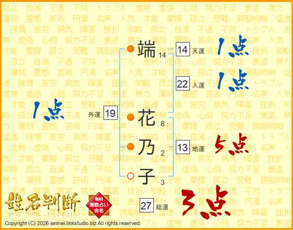 生活面を象徴する運勢です。外部から受ける影響力を表し、結婚運、家庭運や職場、環境への順応性を表します。総運から人運を引いた画数。姓や名が1文字の場合を除く。