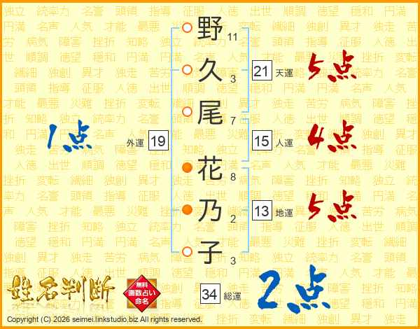 野(11画)久(3画)尾(7画) 花(8画)乃(2画)子(3画)