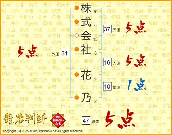 株(10画)式(6画)会(13画)社(8画) 花(8画)乃(2画)
