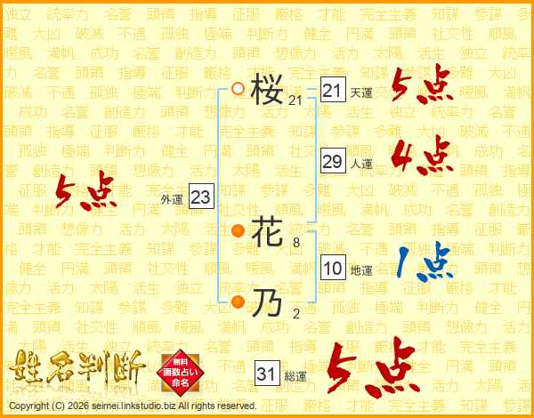 桜花乃さんの総運は31画の5点!