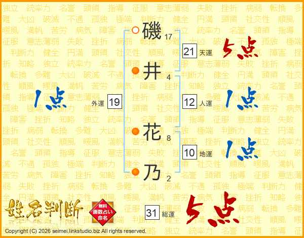 磯(17画)井(4画) 花(8画)乃(2画)
