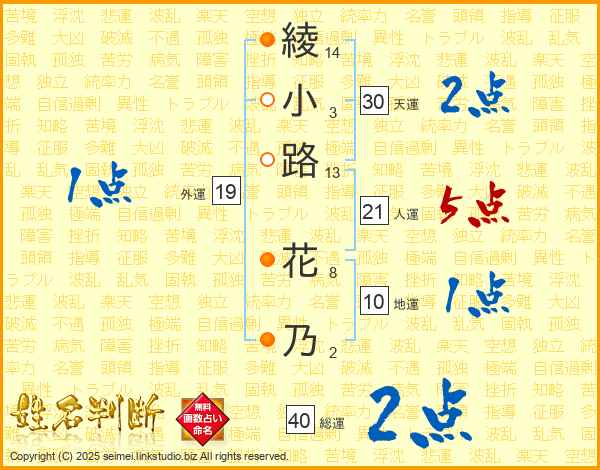 綾(14画)小(3画)路(13画) 花(8画)乃(2画)