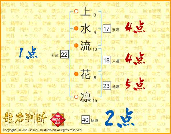 上(3画)水(4画)流(10画) 花(8画)凛(15画)