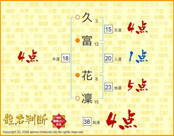 生活面を象徴する運勢です。外部から受ける影響力を表し、結婚運、家庭運や職場、環境への順応性を表します。総運から人運を引いた画数。姓や名が1文字の場合を除く。