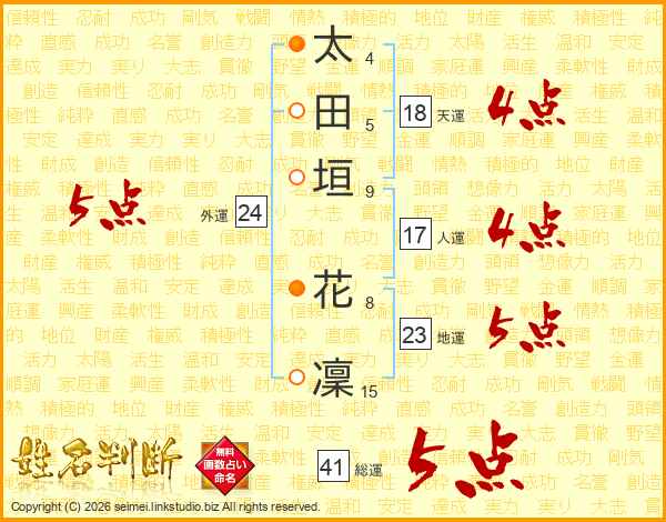 太(4画)田(5画)垣(9画) 花(8画)凜(15画)