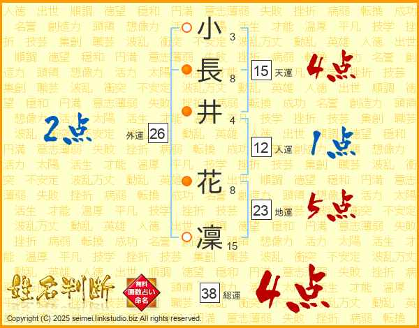 小(3画)長(8画)井(4画) 花(8画)凜(15画)