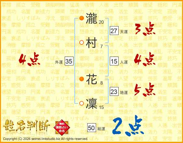 瀧(20画)村(7画) 花(8画)凜(15画)