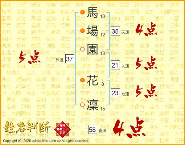 馬(10画)場(12画)園(13画) 花(8画)凜(15画)