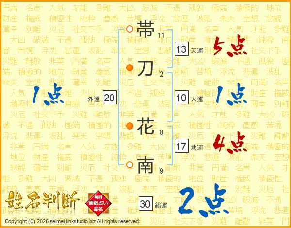 生活面を象徴する運勢です。外部から受ける影響力を表し、結婚運、家庭運や職場、環境への順応性を表します。総運から人運を引いた画数。姓や名が1文字の場合を除く。