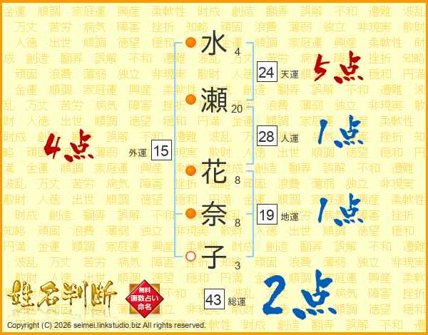 水(4画)瀬(20画) 花(8画)奈(8画)子(3画)