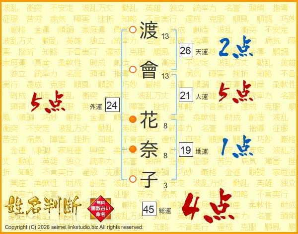 渡(13画)會(13画) 花(8画)奈(8画)子(3画)