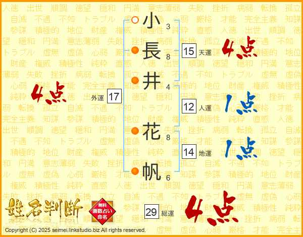 生活面を象徴する運勢です。外部から受ける影響力を表し、結婚運、家庭運や職場、環境への順応性を表します。総運から人運を引いた画数。姓や名が1文字の場合を除く。