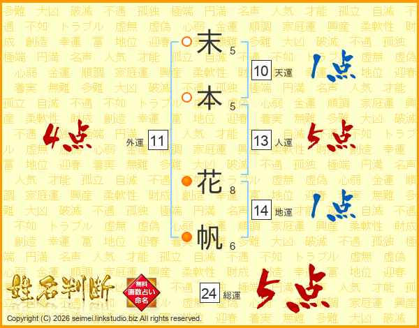 生活面を象徴する運勢です。外部から受ける影響力を表し、結婚運、家庭運や職場、環境への順応性を表します。総運から人運を引いた画数。姓や名が1文字の場合を除く。