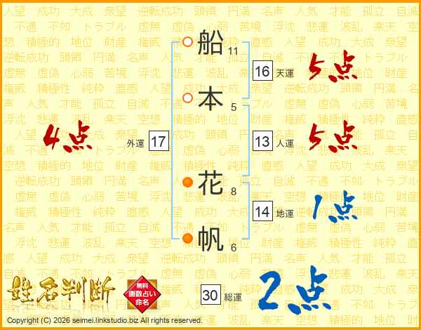 生活面を象徴する運勢です。外部から受ける影響力を表し、結婚運、家庭運や職場、環境への順応性を表します。総運から人運を引いた画数。姓や名が1文字の場合を除く。