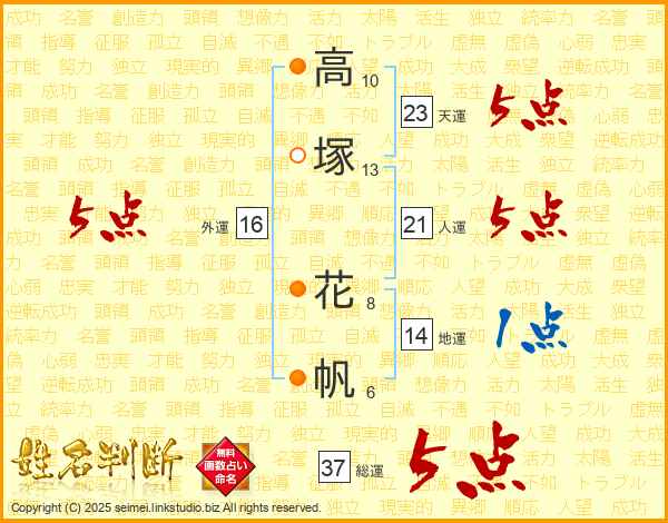 生活面を象徴する運勢です。外部から受ける影響力を表し、結婚運、家庭運や職場、環境への順応性を表します。総運から人運を引いた画数。姓や名が1文字の場合を除く。
