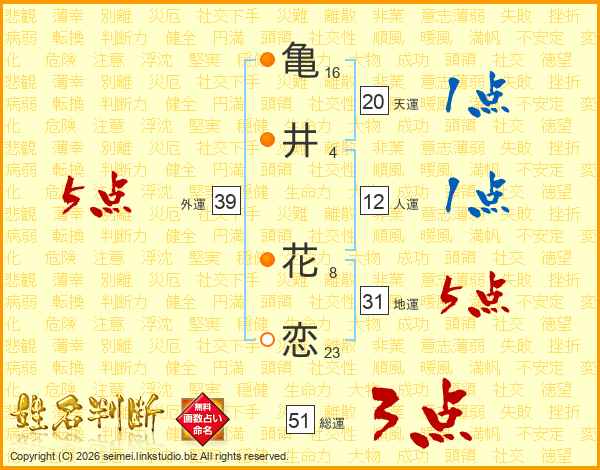 生活面を象徴する運勢です。外部から受ける影響力を表し、結婚運、家庭運や職場、環境への順応性を表します。総運から人運を引いた画数。姓や名が1文字の場合を除く。