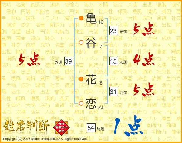 亀(16画)谷(7画) 花(8画)恋(23画)