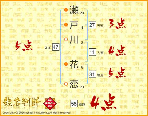 瀬戸川花恋さんの総運は58画の4点!