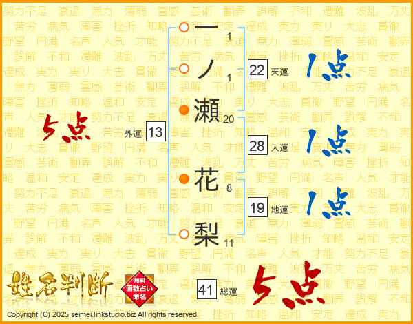 一(1画)ノ(1画)瀬(20画) 花(8画)梨(11画)