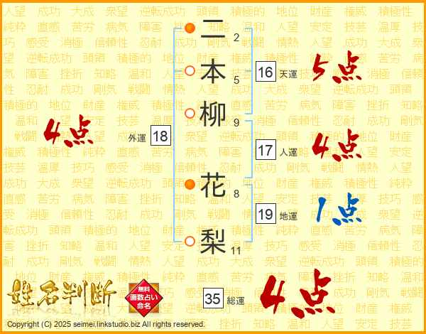 あなたの人生を表す1番重要な運勢です。生涯を通じて影響する総合運となり、主に50歳以降の晩年期に影響を及ぼします。苗字と名前の合計画数。