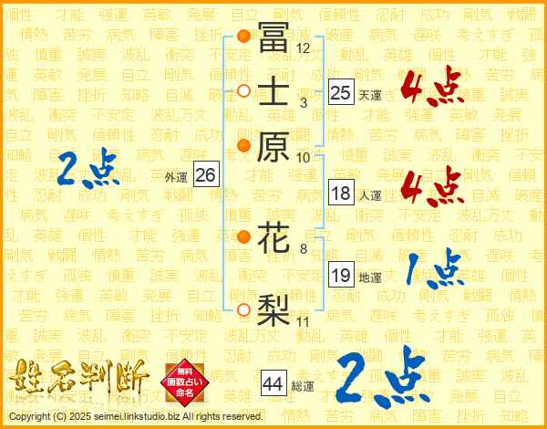 冨(12画)士(3画)原(10画) 花(8画)梨(11画)