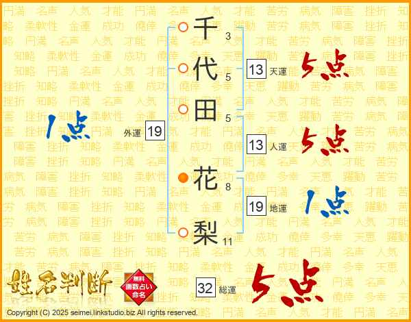 千(3画)代(5画)田(5画) 花(8画)梨(11画)