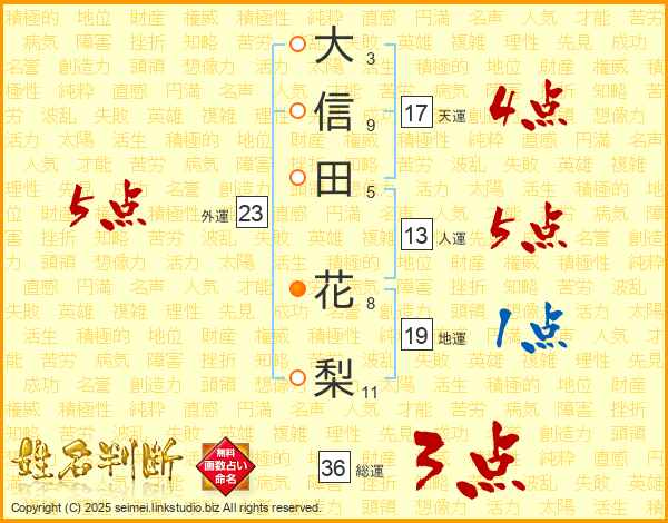 大(3画)信(9画)田(5画) 花(8画)梨(11画)