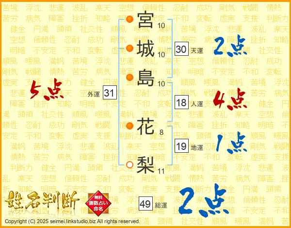 宮(10画)城(10画)島(10画) 花(8画)梨(11画)