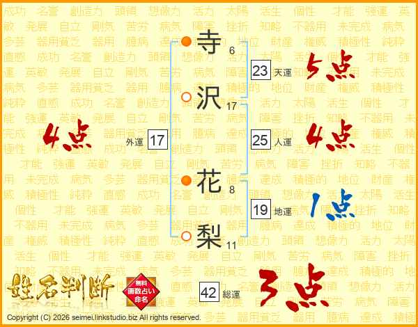 寺(6画)沢(17画) 花(8画)梨(11画)