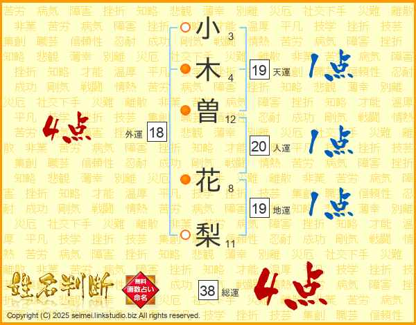 小(3画)木(4画)曽(12画) 花(8画)梨(11画)