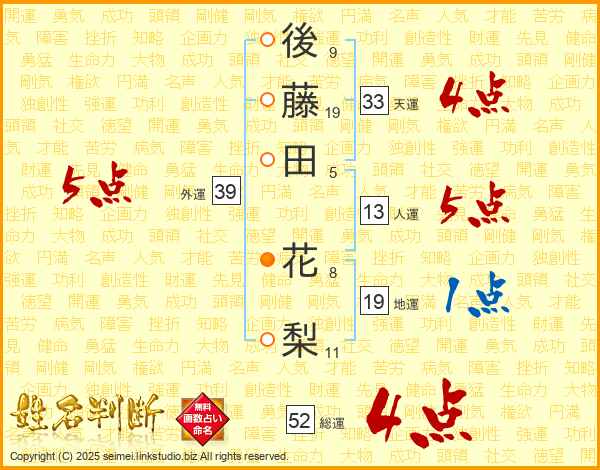 後(9画)藤(19画)田(5画) 花(8画)梨(11画)