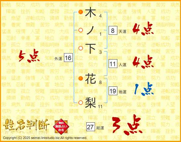 木ノ下花梨さんの総運は27画の3点!