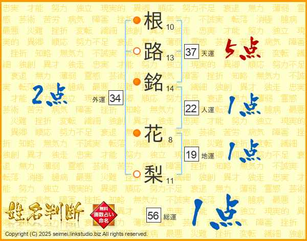 根(10画)路(13画)銘(14画) 花(8画)梨(11画)