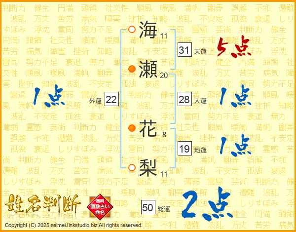海(11画)瀬(20画) 花(8画)梨(11画)