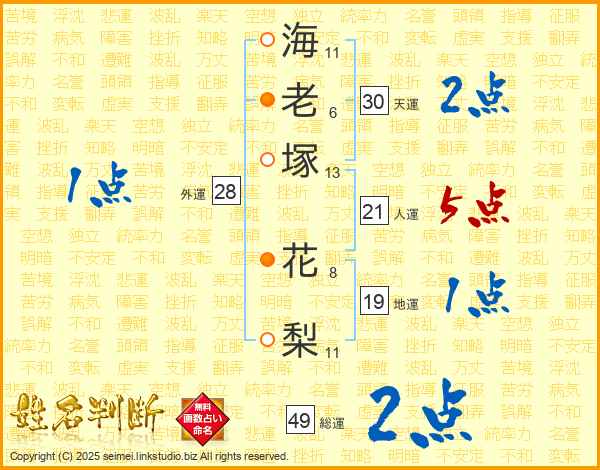 海(11画)老(6画)塚(13画) 花(8画)梨(11画)