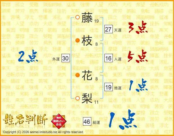 藤(19画)枝(8画) 花(8画)梨(11画)