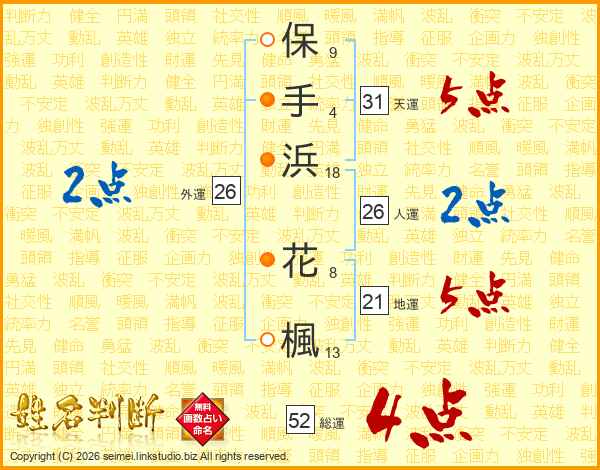 保(9画)手(4画)浜(18画) 花(8画)楓(13画)