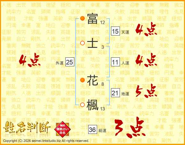 富(12画)士(3画) 花(8画)楓(13画)