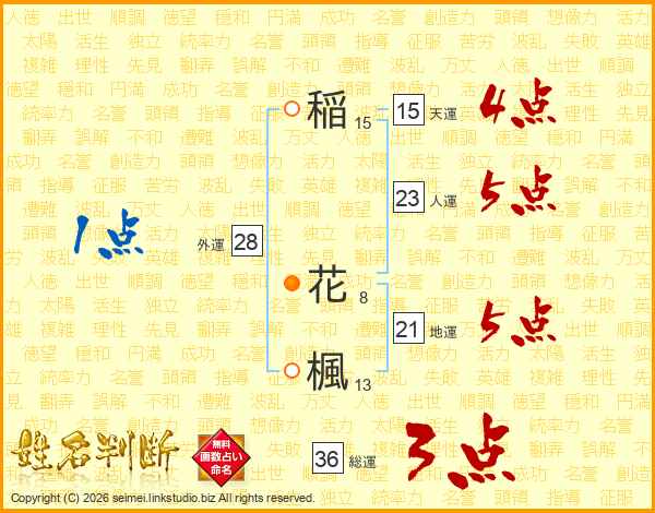 生活面を象徴する運勢です。外部から受ける影響力を表し、結婚運、家庭運や職場、環境への順応性を表します。総運から人運を引いた画数。姓や名が1文字の場合を除く。