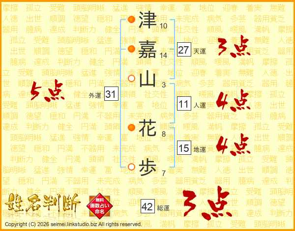津(10画)嘉(14画)山(3画) 花(8画)歩(7画)