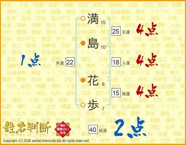 満(15画)島(10画) 花(8画)歩(7画)