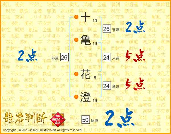 十(10画)亀(16画) 花(8画)澄(16画)