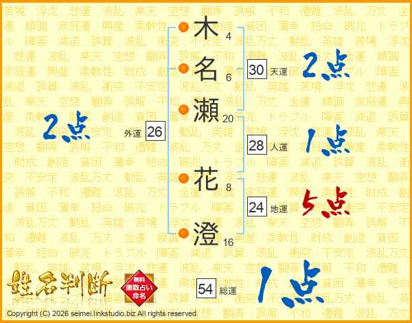 木(4画)名(6画)瀬(20画) 花(8画)澄(16画)